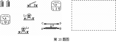 20.在图中,要求用电流表测量灯泡L2中的电流(0.3A),电压表测量灯泡L1的电压, L1、 L2并联,变阻器调节L1的亮度,开关控制整个电路,将符合要求的电路图画在虚线框内,并将实物连接起来。