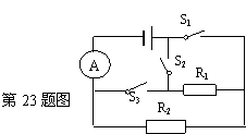 如图所示,R1=20Ω,R2=10Ω,电源电压保持不变。(1)当S2闭合,S1、S3断开时,R1两端的电压为4V,求电流表的示数和电源电压;(2)当S2断开,S1、S3闭合时,求电流表的示数。
