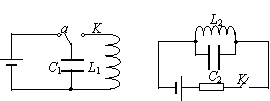 [例2]右边两图中电容器的电容都是C=4×10-6F,电感都是L=9×10-4H,左图中电键K先接a,充电结束后将K扳到b;右图中电键K先闭合,稳定后断开。两图中LC回路开始电磁振荡t=3.14×10-4s时刻,C1的上极板正在____电(充电还是放电),带_____电(正电还是负电);L2中的电流方向向____(左还是右),磁场能正在_____(增大还是减小)。