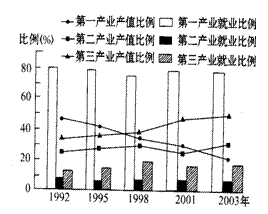 读某地区三次产业产值和就业比例变化图。回答35--36题。