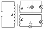 6.如图4所示,理想变压器有三个线圈A、B、C,其中B、C的匝数分别为n2、n3,电压表的示数为U,电流表的示数为I,L1、L2是完全相同的灯泡,根据以上条件可以计算出的物理量是( )