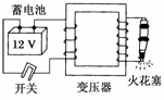 8.汽车消耗的主要燃料是柴油和汽油.柴油机是靠压缩气缸内的空气点火的;而汽油机做功冲程开始时,气缸中的汽油--空气混合气是靠火花塞点燃的.但是汽车蓄电池的电压只有12 V,不能在火花塞中产生电火花,因此,要使用如图6所示的点火装置,此装置的核心是一个变压器,该变压器的初级线圈通过开关连到蓄电池上,次级线圈接到火花塞的两端,开关由机械控制,做功冲程开始时,开关由闭合变为断开,从而在次级线圈中产生10000 V以上的电压,这样就能在火花塞中产生火花了.下列说法中正确的是( )