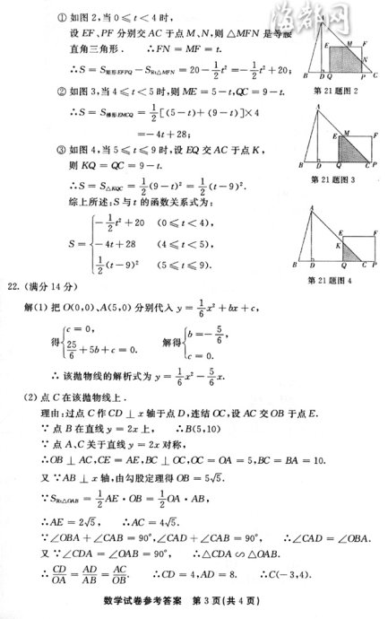 (3)当矩形EFPQ的面颊最大时,该矩形EFPQ以每秒1个单位的速度沿射线QC匀速运动(当点Q与点C重合时停止运动),设运动时间为t秒,矩形EFPQ与△ABC重叠部分的面积为S,求S与t的函数关系式。