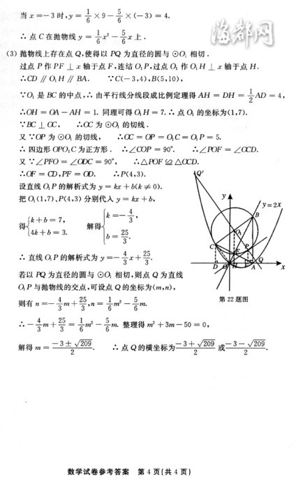 (3)如图2,在(2)的条件下,⊙O1是以BC为直径的圆。过原点O作O1的切线OP,P为切点(P与点C不重合),抛物线上是否存在点Q,使得以PQ为直径的圆与O1相切?若存在,求出点Q的横坐标;若不存在,请说明理由。
