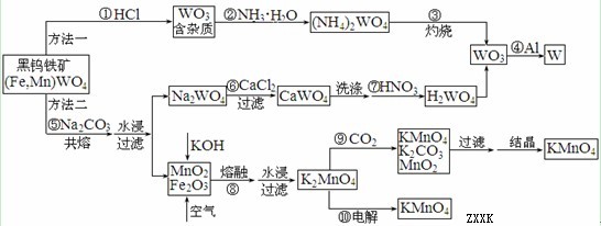 14.(10分)钨是高熔点金属,工业上用黑钨铁矿[(Fe,Mn)WO4]冶炼金属钨有多种方法,同时还可制得副产品高锰酸钾。已知WO3是钨的稳定氧化物,它不溶于水也不溶于酸,可用钨酸(H2WO4,黄色,不溶于水)或某些钨酸盐分解制得。其主要的工艺流程如下: