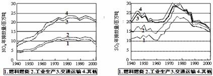 分)SO2和NOx的排放是造成酸雨的两大罪魁祸首。下图表示了某地区在1940~2002年间,空气中SO2和NOx含量因燃料燃烧、工业生产、交通运输以及其他因素的影响而发生变化的基本统计数据。