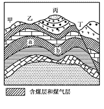 C.丙处为地垒成山 D.丁处为地堑成谷