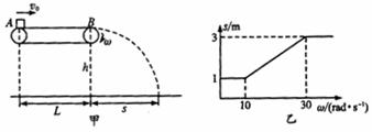 (10分)如图甲所示,水平传送带的长度L=5m,皮带轮的半径R=0.1m,皮带轮以角速度ω顺时针匀速转动。现有一小物体(视为质点)以水平速度v0从A滑上传送带,越过B点后做平抛运动,其水平位移为s。保持物体的初速度v0不变,多次改变皮带轮的角速度ω,依次测量水平位移s,得到如图乙所示的s-ω图象。回答下列问题: