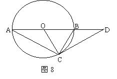 24.如图8.AB是⊙O的直径,∠A=30o,延长OB到D使BD=OB.