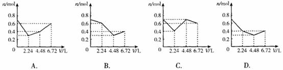 [例10] 往含0.2mol KOH和0.1mol Ca(OH)2的溶液中持续地通入CO2气体,当通入气体的体积为6.72L(标准状况)时立即停止,则在这一过程中,溶液中离子的物质的量n和通入CO2的体积V的关系示意图正确的是(气体的溶解忽略不计) (D)