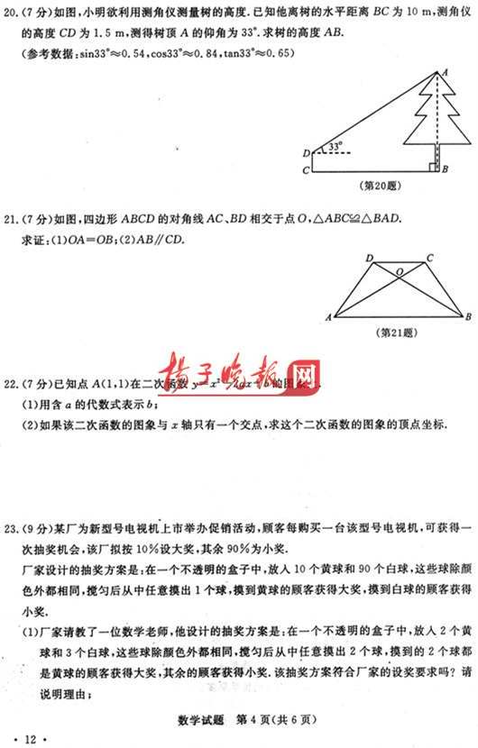 23.(9分)某厂为新型号电视机上市举办促销活动,顾客每购买一台该型号电视机,可获得一次抽奖机会,该厂拟按10%设大奖,其余90%为小奖.
