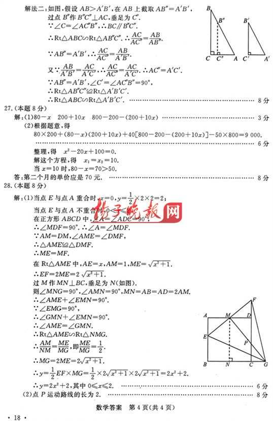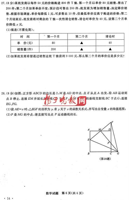 27.(8分)某批发商以每件50元的价格购进800件T恤.第一个月以单价80元销售,售出了200件;第二个月如果单价不变,预计仍可售出200件,批发商为增加销售量,决定降价销售,根据市场调查,单价每降低1元,可多售出10件,但最低单价应高于购进的价格;第二个月结束后,批发商将对剩余的T恤一性清仓,清仓时单价为40元.设第二个月单价降低x元.