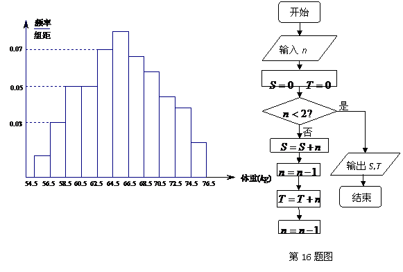 14.为了了解某地区高三学生身体发育情况,抽查了该地区100名年龄为17.5岁~18岁的男生体重(kg) ,得到频率分布直方图,如图.根据下图可得这100名学生中体重在(56.5,64.5)的学生人数是 .