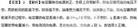 D.油滴静止不动,电流计中的电流从a流向b。![]()