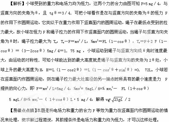 10]用长为 l的细线悬挂一质量为 m的带正电的小球于水平的匀强电场中,电场方向向右,如图所示.若小球所受到的电场力大小为重力的3/4倍,求:若从悬线竖直位置A点由静止开始释放小球,则①悬线对小球的最大拉力为多大?②该小球能上升的最大高度是多少?③若使小球在竖直面内做圆周运动,则小球在A点具有的最小速度是多大?![]()
