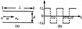 [11]如图(a)所示,A、B表示真空中水平放置的相距为d的平行金属板,板长为L,两板加电压后板间的电场可视为匀强电场,。现在A、B两板间加上如图(b)所示的周期性的交变电压,在t=0时恰有一质量为m、电量为q的粒子在板间中央沿水平方向以速度v0射入电场,忽略粒子的重力,,则下列关于粒子运动状况的表述中正确的是![]()