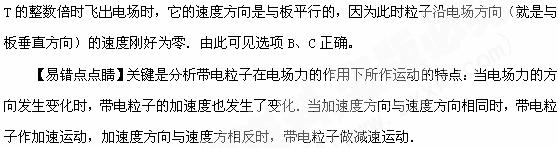 [解析]当 t=0时,带电粒子飞入电场后,在垂直于板的方向上受到电场力的作用,做加速运动,若是粒子在T/2的时间内没有打在极板上,且没有飞出电场,那么在T/2-T的时间内,粒子做匀减速运动,粒子在这段时间内还没有打在极板上,同时还没有飞出电场,当t=T时,粒子沿电场方向的速度为零.在第二个周期内又将重复第一个周期的运动,……所以粒子在垂直于板的方向上的分运动不可能是往复振动,只能是单向运动.当粒子在周期![]()