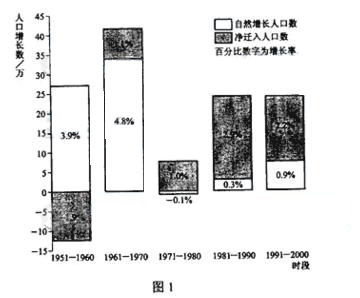 [解析]该题考查考生的读图、析图能力。从图1可以提取以下信息:各时间段该国的自然增长率,各时间段该国的人口迁移率(注意正负关系,即净迁入与净迁出),各时间段该国的人口变化,即增长率,主要原因不同;该国1951---1970年自然增长率较高。1971---2000年净迁入人口较多,根据两个时间段人口的自然增长情况和机械增长情况,50年间该国为人口净迁入国。