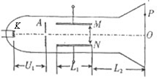 *17.如图所示为一真空示波管,电子从灯丝K发出(初速度不计),经灯丝与A板间的加速电压U1加速,从A板中心孔沿中心线KO射出,然后进入两块平行金属板M、N形成的偏转电场中(偏转电场可视为匀强电场),电子进入M、N间电场时的速度与电场方向垂直,电子经过电场后打在荧光屏上的P点。已知加速电压为U1,M、N两板间的电压为U2,两板间的距离为d,板长为L1,板右端到荧光屏的距离为L2,电子的质量为m,电荷量为e。求: