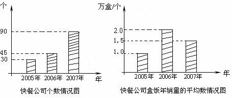 15、(北京市朝阳区2008年高三数学一模)某校高中研究性学习小组对本地区2006年至2008年快餐公司发展情况进行了调查,制成了该地区快餐公司个数情况的条形图和快餐公司盒饭年销售量的平均数情况条形图(如图),根据图中提供的信息可以得出这三年中该地区每年平均销售盒饭( )