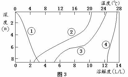 某研究性学习小组调查了一个温带湖泊的情况,并将冬季和夏季不同水深的氧气含量和温度绘成曲线图,如图3所示。在一定温度和压强下,气体在一定量溶剂中溶解的最高量称为气体的溶解度。据此完成7-8题。