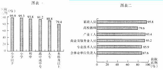 15.(2009广东卷)下面的图表一和图表二,是有关机构对我国不同群体通过电视获取科技信息情况的调查:请根据图表反映的情况,补充下面义段中A、B、C处空缺的内容(不出现数字),使上下文语意连贯。