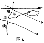 图A中的40°线为纬线,a、b、c为等温线,甲为河流;图B为甲地区近地面气压分布及风向示意图。读图,回答21-22题。
