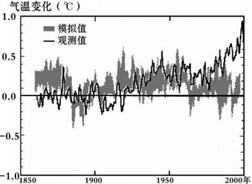 材料一:近现代全球年平均气温变化曲线图(下图)。图中灰色线条代表的是仅考虑自然变化得到的气温变化模拟值,黑色线条代表的是实际气温观测值。