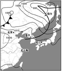 30.下图为东亚部分地区地理简图,图中等值线表示2008年11月2日15时(北京时间)东亚地区海平面气压分布状况,黑色粗曲线表示锋面。读图回答下列问题。