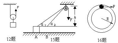 15、某人利用如图所示的装置,用100N的恒力F作用于不计质量的细绳的一端,将物体从水平面上的A点移到B点。已知α1=30°,α2=37°,h=1.5m,不计滑轮质量及绳与滑轮间的摩擦,求绳的拉力对物体所做的功?50J