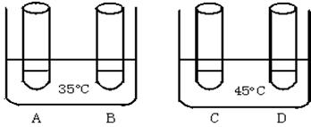 12.如下图,在下列试管中均加入3mL浆糊(淀粉糊)。A、C两试管各注入2毫升清水,B、D两试管各注入2毫升新鲜唾液,四支试管均置于水槽保温5分钟,分别滴入2滴碘液,其中不变为蓝色的是: ( )