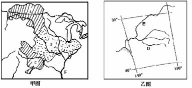 (1)甲、乙图中河流名称是:D ;E ;F 。(3分)