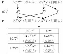 P:红眼(♀)×白眼(♂)→F1:红眼(♀和♂) F2:3/4红眼(♀和♂)、1/4白眼(♂)。