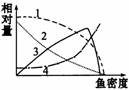 [基础训练]1、如图表示在一个池塘中当鱼的密度上升时,鱼产量、个体生长量、食物量和寻食耗能量的变化曲线。其中能代表鱼个体生长量和鱼产量的曲线是( A )