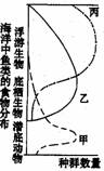 [高考模拟]4、(2007全国卷Ⅱ5)下图纵向表示海洋不同深度中鱼类的食物分布状况,曲线甲、乙、丙分别表示三种鱼的数量变化。下列对此图的分析,错误的是( D )