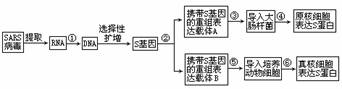 4、(2007海南生物19)已知SARS是由一种RNA病毒感染所引起的疾病。SARS病毒表面的S蛋白是主要的病毒抗原,在SARS病人康复后的血清中有抗S蛋白的特异性抗体。某研究小组为了研制预防SARS病毒的疫苗,开展了前期研究工作。其简要的操作流程如下: