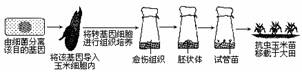 (2007江苏生物42B)很久以前科学家在土壤中发现了某种细菌能制造一种对昆虫有毒的蛋白质,当时许多人就想把编码这一蛋白质的基因(抗虫基因)转移到农作物中,以降低昆虫对农作物造成的危害。20世纪90年代,美国科学家采用基因工程技术首次培育出抗虫玉米新品种。下图为这一转基因玉米的主要培育过程。