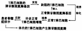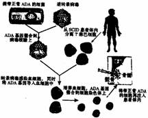 在人类的遗传病中,有一种重症联合免疫缺陷病(简称SCID),这种患者缺乏正常的人体免疫功能,只要稍被细菌或病毒感染,就会发病死亡。经研究证实,SCID病人细胞的一个常染色体上编码腺苷酸脱氨酶(简称ADA)的基因ada发生了突变。目前,人们已经找到了治疗该疾病的方案。如图: