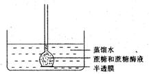 14.如下实验装置,玻璃槽中是蒸馏水,半透膜允许单糖透过。倒置的长颈漏斗中先装入蔗