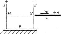 16.(18分)如图所示;“U”形框架由两平行金属板A、B和绝缘底座P组成,在金属板A、B上同一高度处开有两个小孔M、N,并在M、N之间固定一绝缘光滑平板,整个装置总质量为M=1kg,静止在光滑水平面上.两平行金属板A、B组成的电容器的电容为C=6.25×10-7F,金属板带电量为Q=0.2C,间距为d=0.1m.现有一电荷分布均匀的带电量为q=5×1 0-5C,质量为m=1kg,长度为l=0.1m的绝缘橡胶棒以v0=10 m/s的速度由右边小孔水平滑入“U”形框架中,设绝缘棒的电荷量对“U”形框架内的电场没有影响.问: