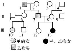 15.右图为某族甲(基因为A、a)、乙(基因为B、b)两种遗传病的系谱,其中一种为红绿色盲症。据图分析下列叙述正确的是 ( )