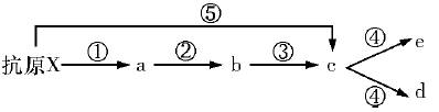 20.人体的某种可产生抗体的免疫反应过程可表示为右图,其中a~e代表不同免疫细胞,①~⑤代表生理过程。下列表述错误的是 ( )