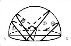 下图为北半球甲乙两地某日“太阳视运动路线图”,圆O为地平圈,箭头为太阳视运动方向,<1=<2=22º。回答4-6题。