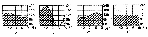 下面四幅昼夜长短的季节变化示意图(阴影部分为黑夜)中,表示乙地的是( )
