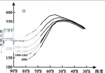 (2)从已知的9月份臭氧层分布的坐标图中,提取:臭氧层总量逐年减少;中高纬度减少幅度大;中纬度30~50左右,减少幅度较小;臭氧层总量最小值出现在极地地区且位置正逐渐北移;峰值出现位置也日趋北移。