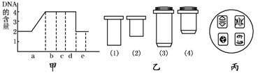 10.(2010·哈尔滨质检)下面甲图示洋葱根尖分生区连续分裂的细胞在各个时期细胞核内DNA含量的测定结果,乙图是一组目镜标有×5和×15字样、物镜标有×10和×40字样的镜头,丙图是某同学在乙图中选用的一组能放大50倍的镜头组合所观察到的图像。欲将丙图视野中处于甲图c时期的细胞移至视野中央进行600倍高倍镜观察,正确的镜头组合及操作程序应是 ( )