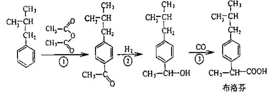 4.(江苏省南京市2009届高三年级质量检测)(12分)芬必得是一种解热镇痛药物,其有效成分是布洛芬(Ibuprofen)。下列是某公司新发明的布洛芬(Ibuprofen)绿色合成方法流程图(反应条件省略)。
