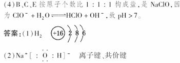17.(2009·宿州模拟)A、B、C、D、E是原子序数依次增大的五种短周期元素。A原子的电子层数与它的核外电子总数相同,A与C、B与D分别为同主族,B和C的最外层电子数之和与E的最外层电子数相同。A与E形成的化合物化学式为AE,其分子中含18个电子。