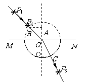 (2)(4分)如图所示,某同学用插针法测定一半圆形玻璃砖的折射率.在平铺的白纸上垂直纸面插大头针P1、P2确定入射光线,并让入射光线过圆心O,在玻璃砖(图中实线部分)另一侧垂直纸面插大头针P3,使P3挡住P1、P2的像,连接O P3.图中MN为分界面,虚线半圆与玻璃砖对称,B、C分别是入射光线、折射光线与圆的交点,AB、CD均垂直于法线并分别交法线于A、D点. 设AB的长度为l1,AO的长度为l2,CD的长度为l3,DO的长度为l4,为较方便地表示出玻璃砖的折射率,需用刻度尺测量 (用上述给出量的字母表示),则玻璃砖的折射率可表示为 .