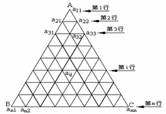 2、如图, 把正三角形ABC分成有限个全等的小正三角形, 且在每个小三角形的顶点上都放置一个非零实数, 使得任意两个相邻的小三角形组成的菱形的两组相对顶点上实数的乘积相等. 设点A为第一行,…, BC为第n行, 记点A上的数为